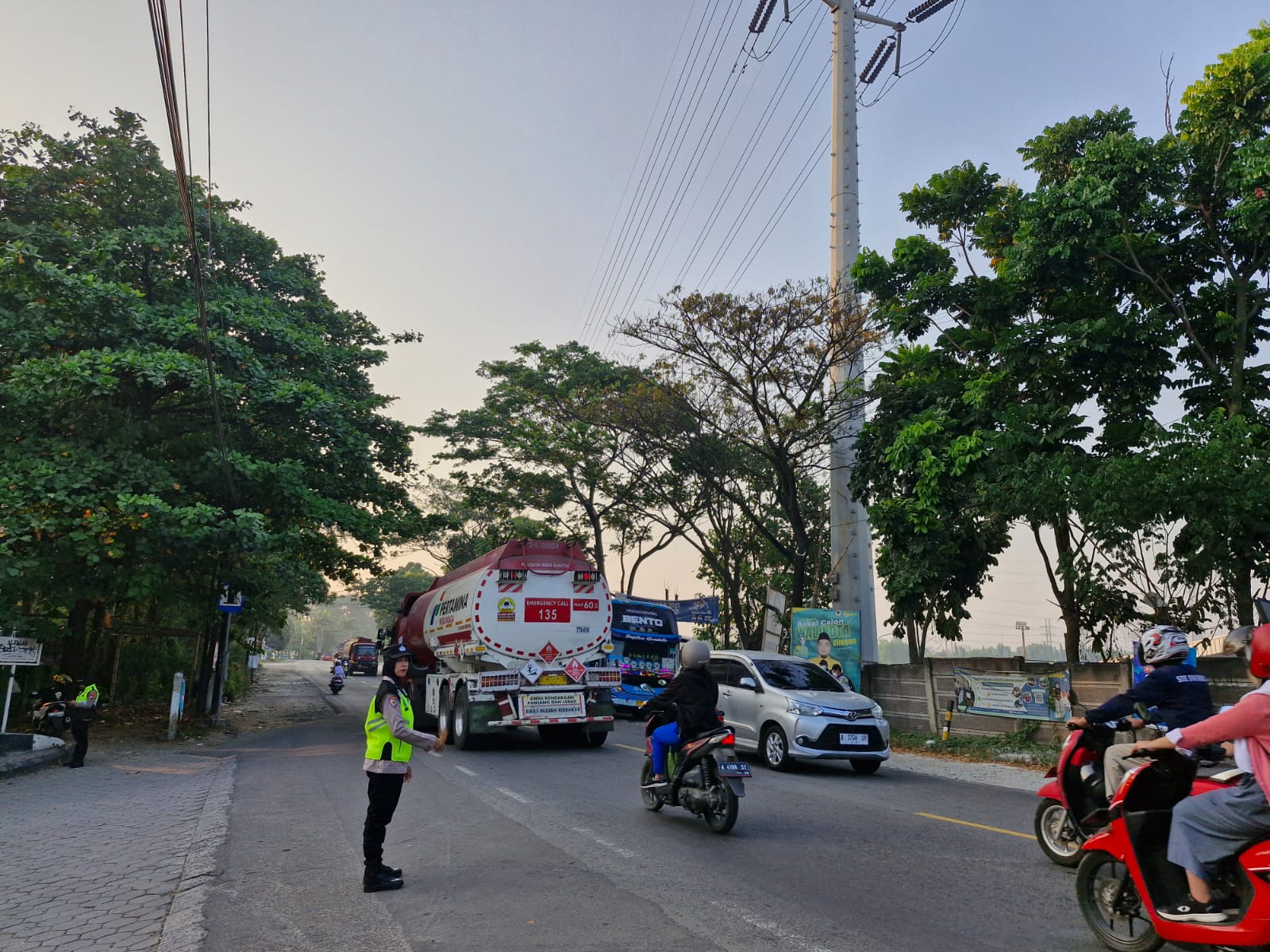 Cilegon,Polres Cilegon Polda Banten Pada Selasa/07/10/2025 Pukul 06.30 Wib, Personil Siwas Polres Cilegon, Aipda Emi Prasetyo melaksanakan kegiatan pengaturan arus lalu lintas di Jalur Protokol jalan utama Kota Cilegon tepat nya di jalur depan perumahan arga baja Pura Kota Cilegon.