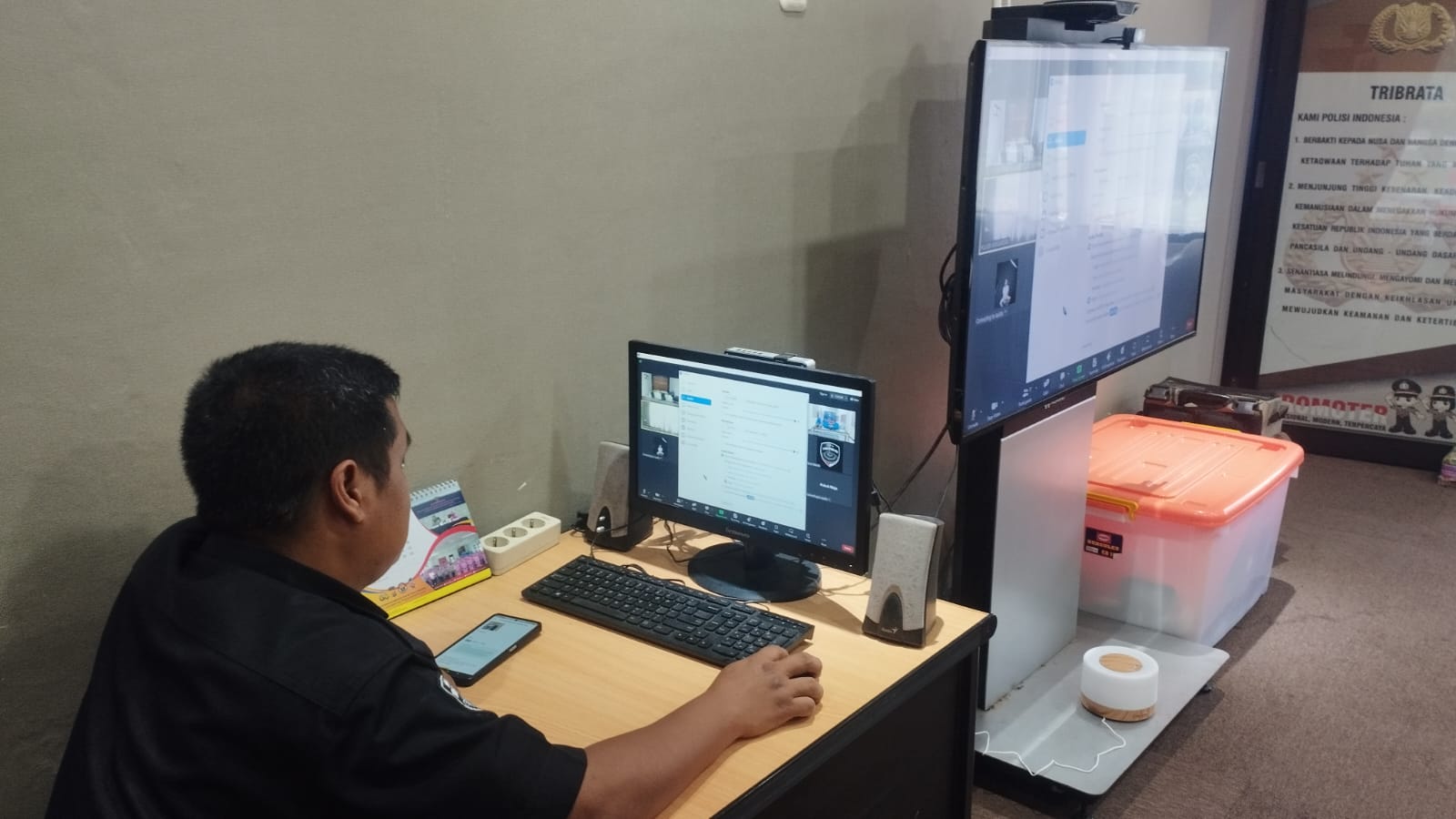 Anggota Tik Polres Cilegon Menyiapkan Sarana dan Prasarana Untuk Kegiatan Zoom meeting Dalam pelaksanaan kegiatan zoom meeting tersebut anggota TIK Polres Cilegon yang bertanggung jawab untuk menyiapkan peralatan zoom. Selain itu agar di tidak ada gangguan jaringan sebelum pelaksanaan anggota TIK melakukan pemeriksaan terhadap sarana dan prasarana tersebut . Satu jam sebelum kegiatan zoom meeting itu dimulai. Kapolres Cilegon AKBP. DR. MARTUA RAJA TARIPAR LAUT SILITONGA. melalui Kasi TIK IPTU Lukman menyampaikan bahwa “untuk menunjang kelancaran penyampaian informasi anggota TIk Polres Cilegon selalu memeriksa sarana dan prasarana tersebut, sebelum maupun pada saat pelaksanaan akan selalu di monitor”