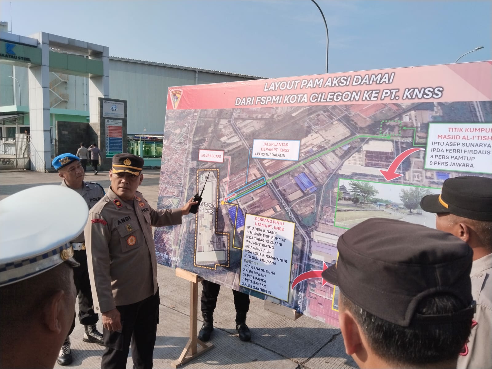 Kapolres Cilegon AKBP Dr. MARTUA RAJA TARIPAR LAUT SILITONGA, S.H., S.I.K., M.Si, melalui Kabagops AKP CHOIRUL ANAM, S.H., M.H., M.Si, menyampaikan bahwa pihak kepolisian telah berkoordinasi dengan panitia aksi serta manajemen PT. KNSS guna mengantisipasi potensi gangguan keamanan dan menjaga situasi tetap damai.