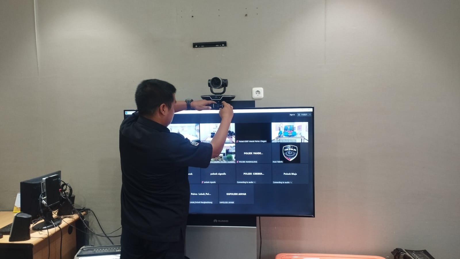 Anggota Tik Polres Cilegon Menyiapkan Sarana dan Prasarana Untuk Kegiatan Zoom meeting Dalam pelaksanaan kegiatan zoom meeting tersebut anggota TIK Polres Cilegon yang bertanggung jawab untuk menyiapkan peralatan zoom. Selain itu agar di tidak ada gangguan jaringan sebelum pelaksanaan anggota TIK melakukan pemeriksaan terhadap sarana dan prasarana tersebut . Satu jam sebelum kegiatan zoom meeting itu dimulai. Kapolres Cilegon AKBP. DR. MARTUA RAJA TARIPAR LAUT SILITONGA. melalui Kasi TIK IPTU Lukman menyampaikan bahwa “untuk menunjang kelancaran penyampaian informasi anggota TIk Polres Cilegon selalu memeriksa sarana dan prasarana tersebut, sebelum maupun pada saat pelaksanaan akan selalu di monitor”