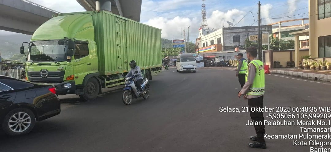 Personil Polsek KSKP Merak Lakukan Pengaturan Antrian Kendaraan di Pelabuhan Merak