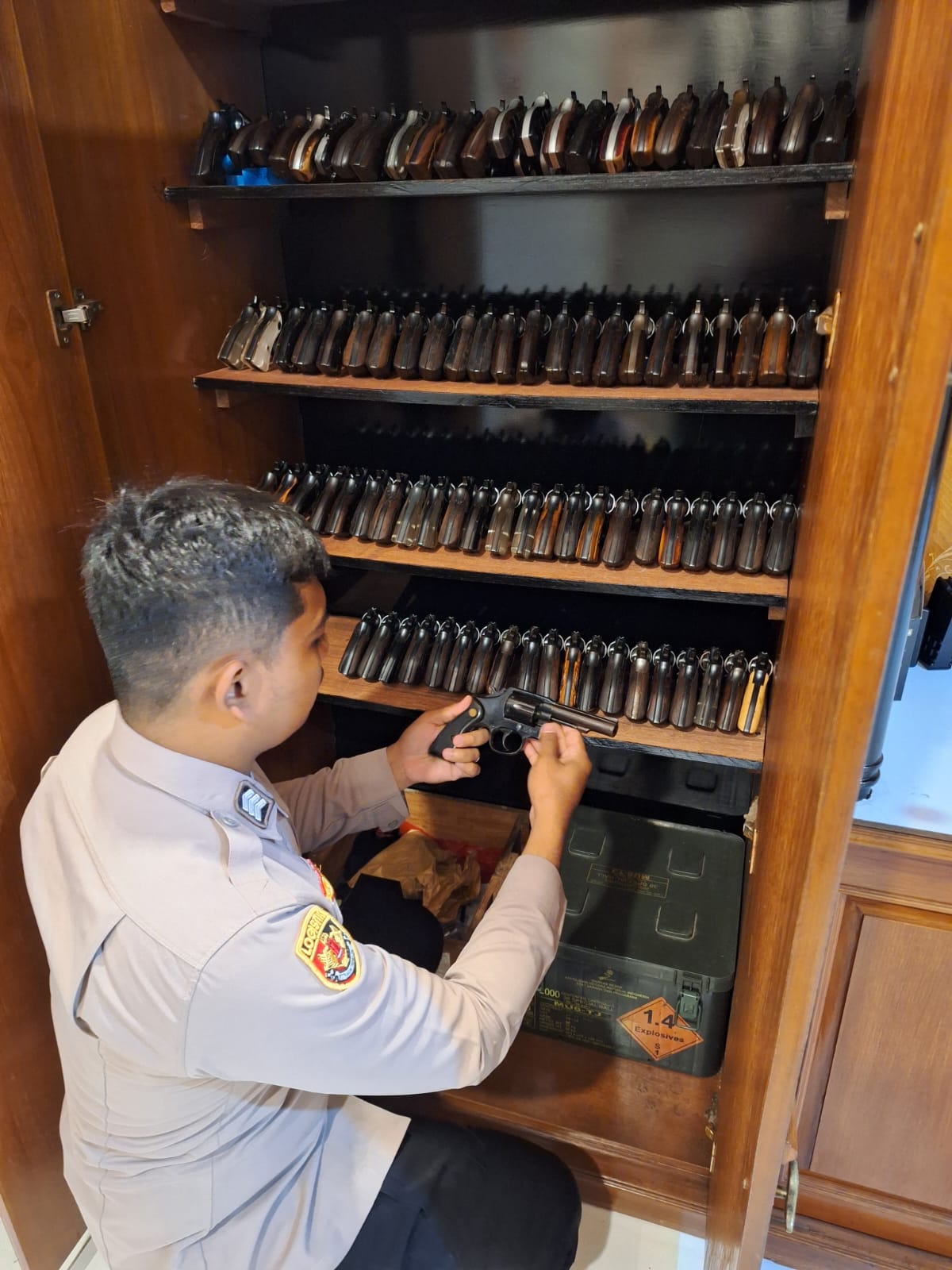STAFF LOGISTIK MEMBERSIHKAN SENJATA API DI GUDANG POLRES CILEGON
