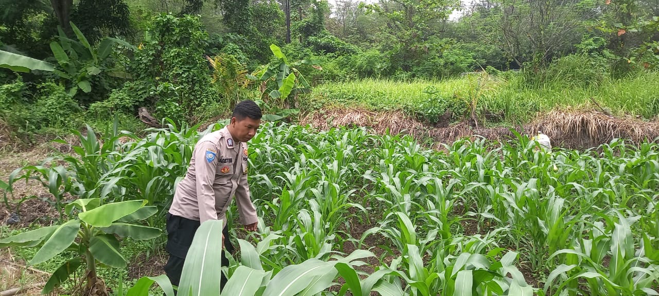 Bripka Agustoni, Babinkamtibmas Kelurahan Kotabumi, Kecamatan Purwakarta, Kota Cilegon, melaksanakan pengecekan tanaman jagung di wilayah binaannya