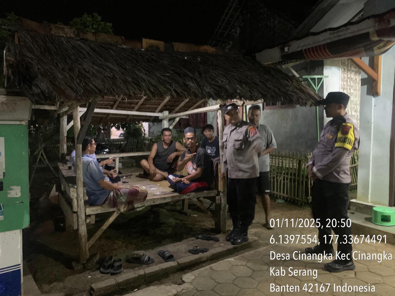 *Polres Cilegon* || Personel Bhabinkamtibmas Polsek Cinangka melaksanakan Program Komandan Wish Kapolda Banten RONDA SATKAMLING menyampaikan komunikasi dengan Petugas Siskamling agar berperan aktif dalam menciptakan Harkamtibmas yang aman dan Kondusif, Minggu (02/11/2025).