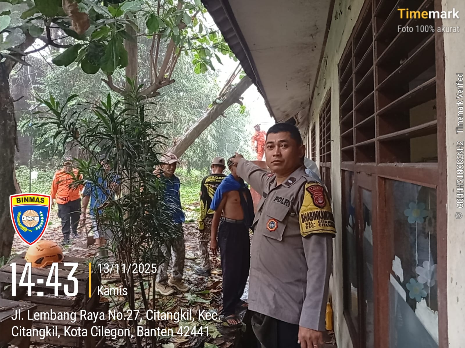 Cilegon - Pohon ketapang tumbang dan menimpa gedung SDN Tegal Cabe, Lingkungan Tegal Cabe RT 04/02, Kelurahan Citangkil, Kecamatan Citangkil, Kota Cilegon, Kamis (13/11/2025).