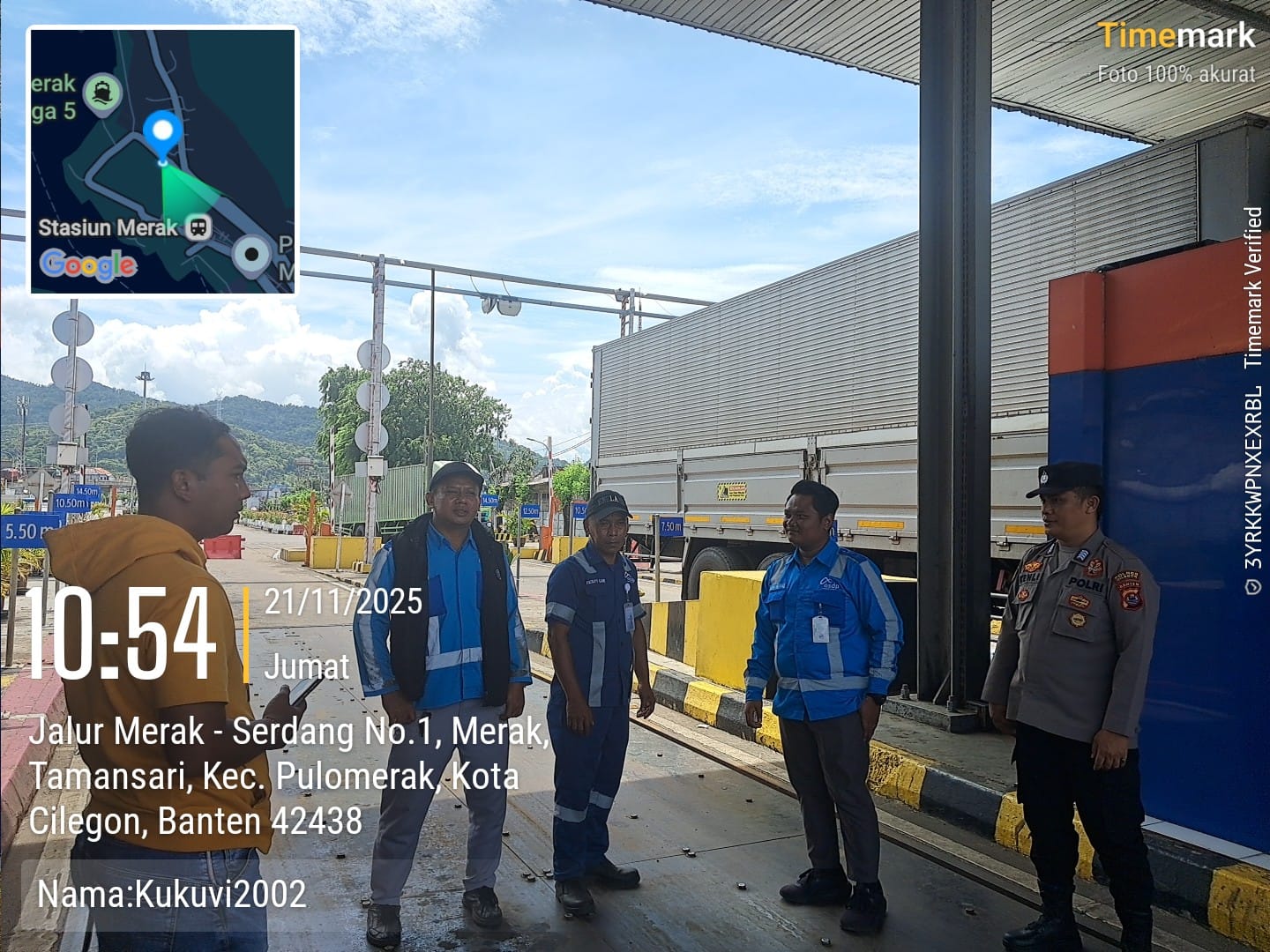 Cilegon - Personel Polsek Kskp Merak Polres Cilegon Polda Banten melaksanakan sambang dan patroli kawasan pelabuhan merak dalam rangka menjaga Harkamtibmas di Kawasan Pelabuhan Merak, Jumat (21/11/2025).