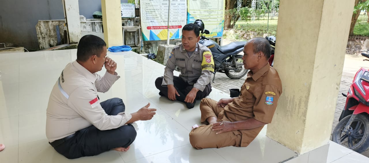 Bhabinkamtibmas Polsek Anyar Polres Cilegon Polda Banten Bripka Asep melaksanakan Sambang dialogis dengan Sekdes Ds. Bandulu Kec. Anyar dan Pendamping Desa dalam rangka menjaga di Desa Binaannya sebagai bentuk mendukung Program Quick Wins Presisi Polri, Selasa (25/11).