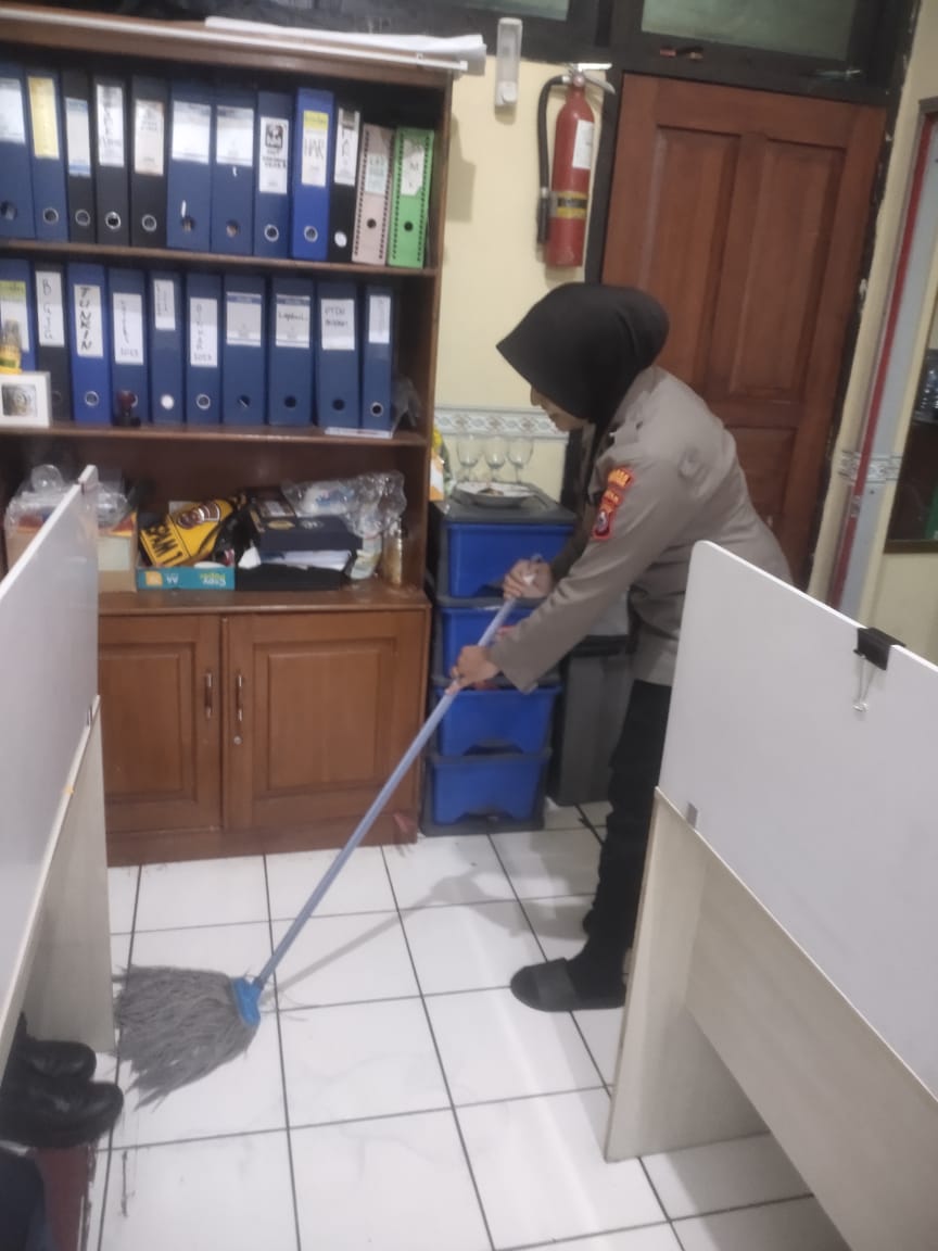 Anggota Bag SDM Polres Cilegon, selalu aktif pelaksanaan aktivias rutiin dalam membersihkan ruangan kerja.