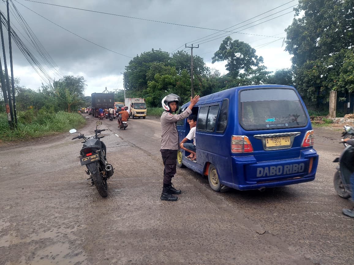 Laksanakan Strong Poin Di Sore Hari, Bripka Bambang Personil Polsek Bojonegara Laksanakan Giat Pengaturan Lalin Di Jalan Raya PT Bam Bojonegara
