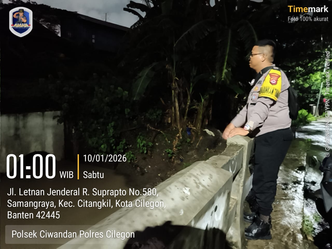 Cilegon - Personil Polsek Ciwandan Polres Cilegon Polda Banten, melaksanakan patroli antisipasi cuaca ekstrem di daerah hukumnya pada, Sabtu (10/01/2026).