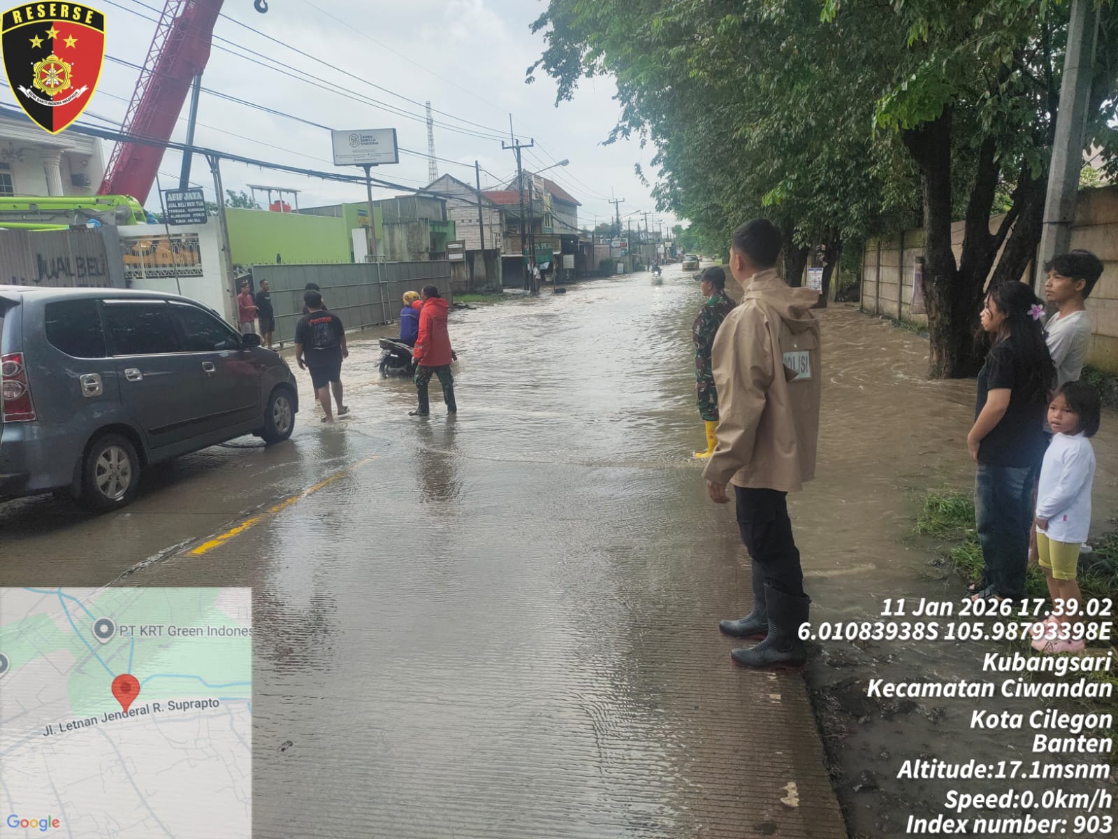 Dalam upaya penanganan dampak Banjir/ Genangan Air di Jalan Raya Ciwandan – Anyer didepan Koramil Ciwandan Dan kawasan Kiec II Kelurahan Tegal Ratu Kecamatan Ciwandan Kota Cilegon dengan ketinggian debit air 40 cm sehingga jalur 2 (dua) arah tidak dapat dilintasi oleh kendaraan baik R2 maupun R4 pribadi, tuturnya.
