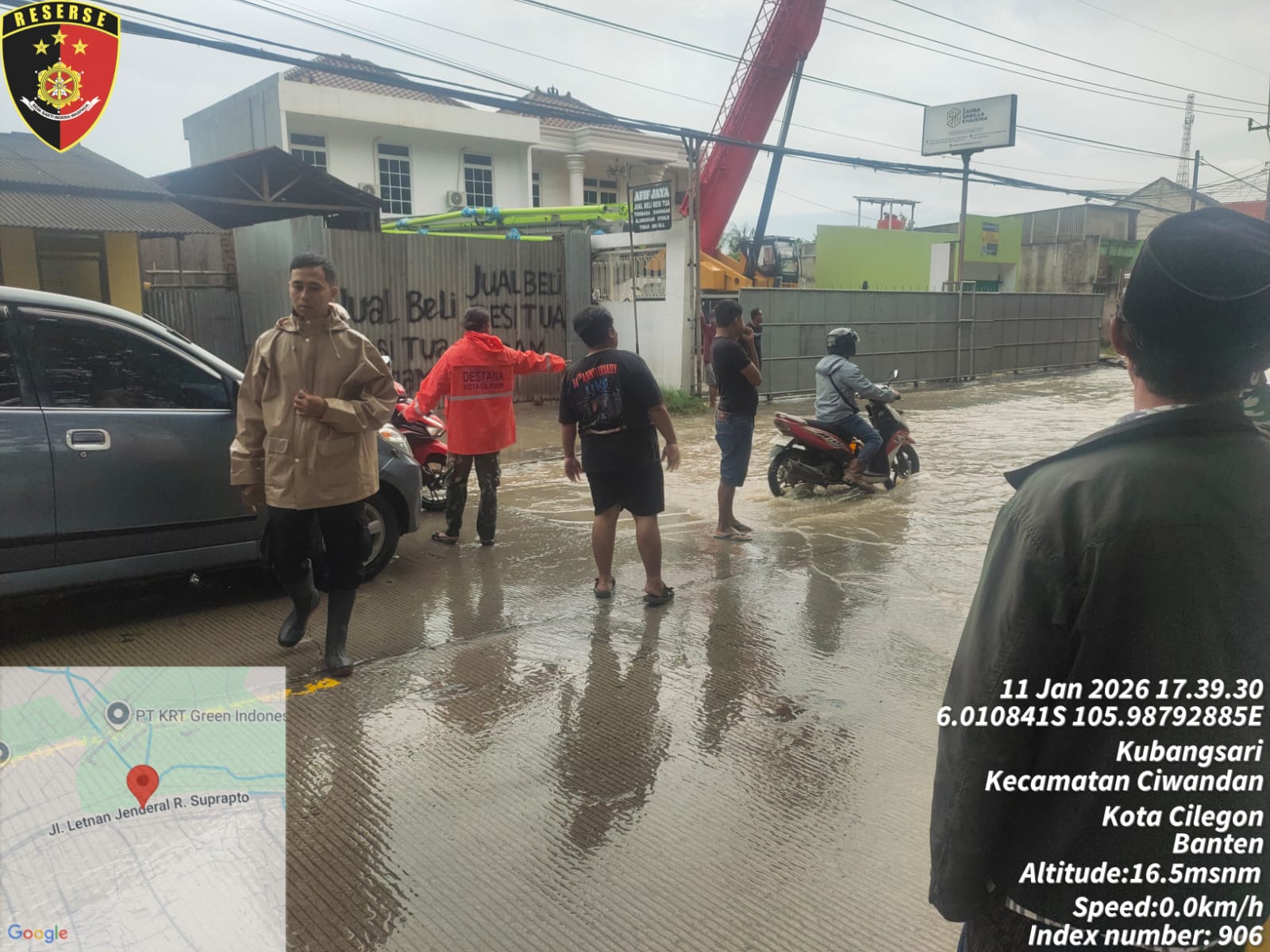 *Cilegon* - Hujan Dengan Intensitas yang Cukup Tinggi Pada hari Minggu tanggal 11 Januari 2026 Personil Polsek Ciwandan Polres Cilegon Polda Banten Melaksanakan Rekayasa Lalu-lintas di titik rawan Genangan Air, Minggu (11/01/2026).