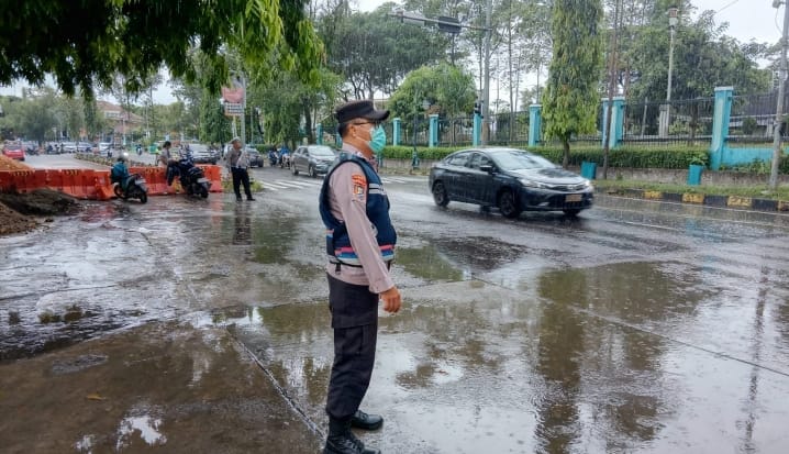 Selain pengaturan lalu lintas, personel juga memberikan himbauan kepada pengguna jalan untuk selalu mematuhi peraturan lalu lintas dan menjaga keselamatan berkendara.