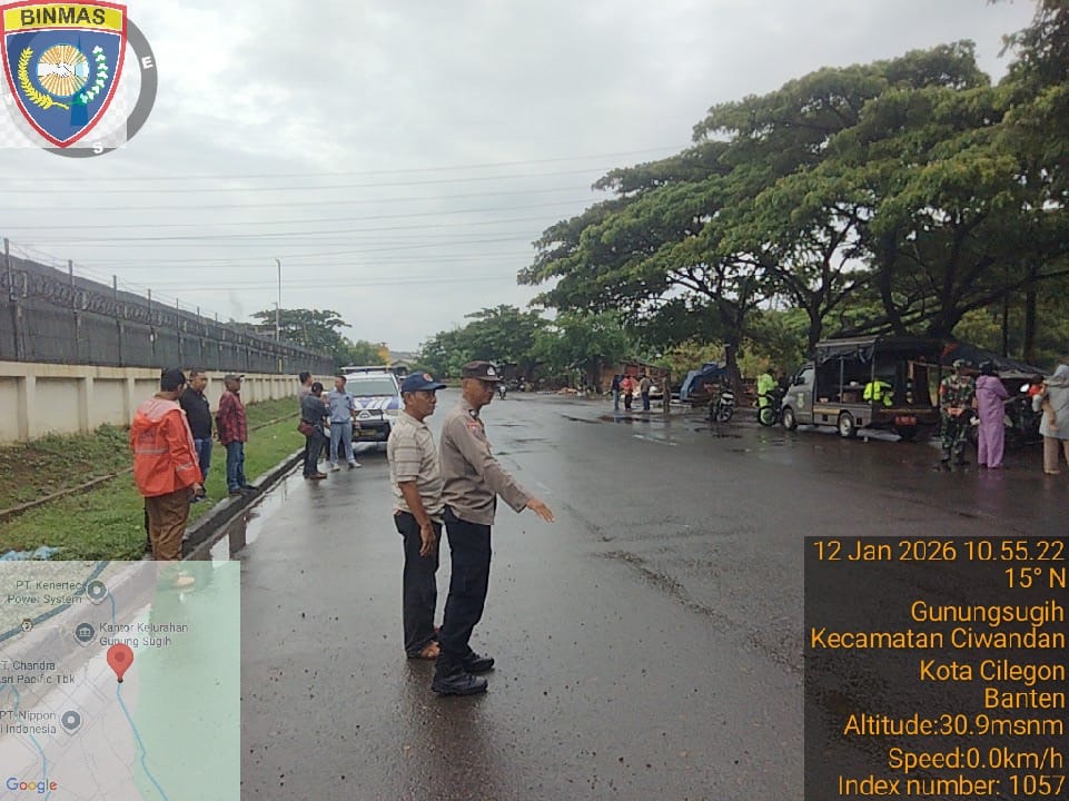Cilegon - Personil Polsek Ciwandan Polres Cilegon Polda Banten melakukan pengawasan pembongkaran bangunan liar di atas tandon di Jl. Sunan Kali Jaga, Kelurahan Gunung Sugih, Kecamatan Ciwandan, Kota Cilegon. Senin (12/01/2026).