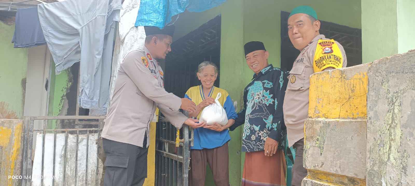 Kapolres Cilegon Polda Banten AKBP Dr. Martua Raja Taripar Laut Silitonga, S.H., S.I.K., M.Si.Melalui Kapolsek Mancak Polres Cilegon Polda Banten AKP Andi Aas Mario Membenarkan Bahwa Kedatangan Personil Polsek Mancak selain melaksanakan patroli dialogis juga Berbagi kepada warga kurang mampu/yang membutuhkan untuk memberikan bantuan Sembako di sekitar Warga Kp. Kambangan Desa Ciwarna kecamatan Mancak.