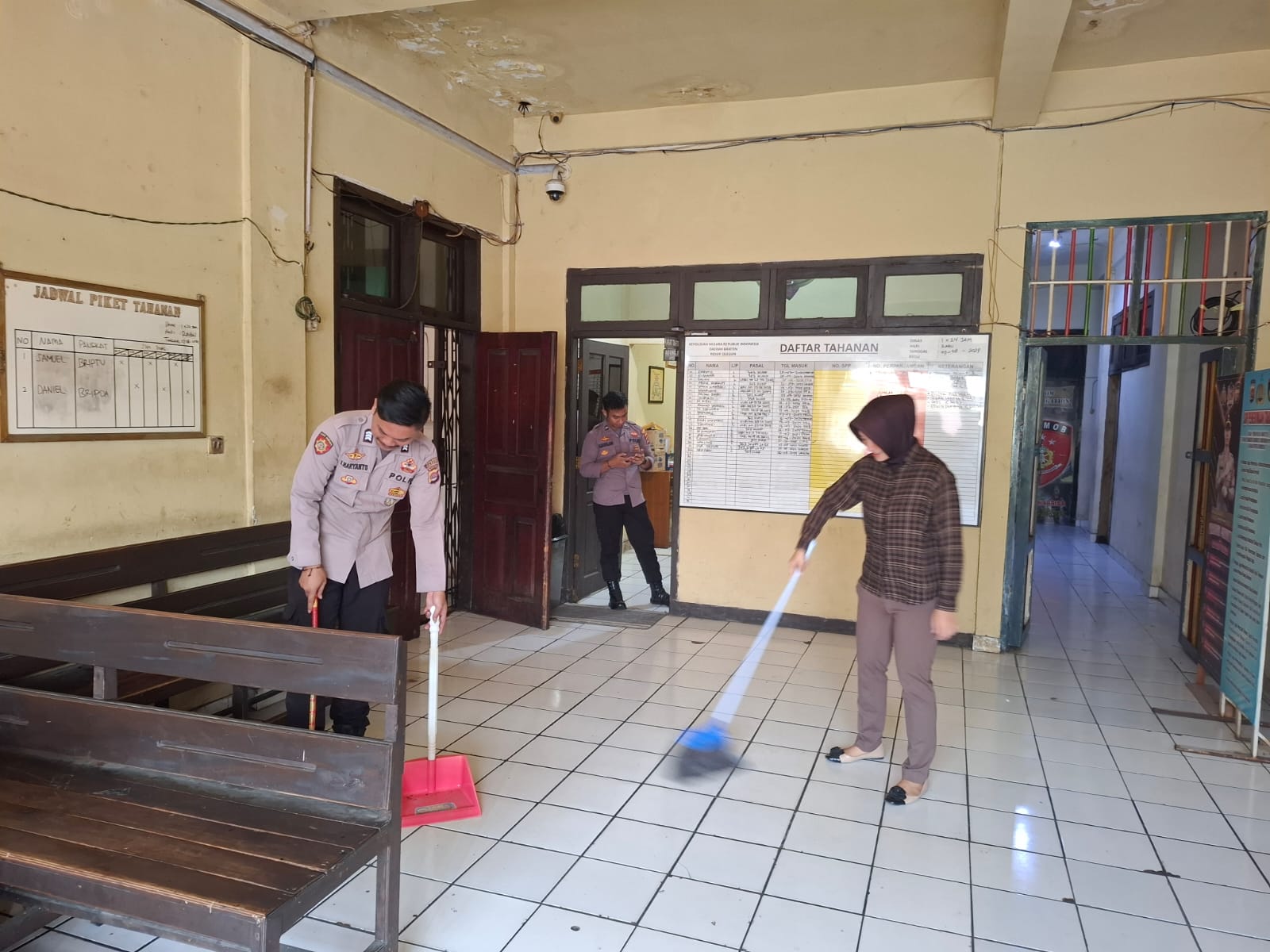Anggota Piket Sattahti Polres Cilegon Selalu Melakukan Merutinkan Bersih-Bersih Di Sekitar Rutan Polres Cilegon Agar Terhindar Dari Penyakit.