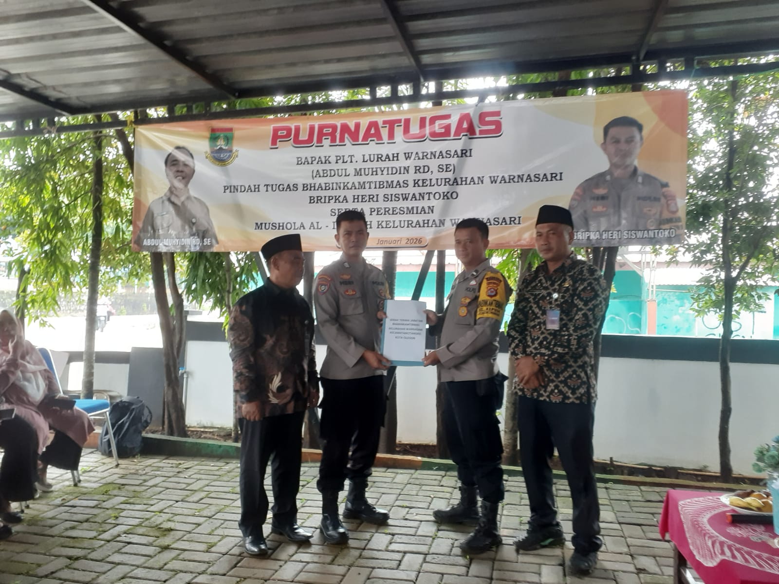 Cilegon - Bhabinkamtibmas Kelurahan Warnasari, AIPDA Mere Erlansyah, dan Bhabinkamtibmas Kelurahan Kepuh, BRIPKA Heri Siswantoko menghadiri kegiatan purna tugas PLT Lurah Warnasari dan pindah tugas Bhabinkamtibmas Kelurahan Warnasari, serta peresmian Mushola Al-Inayah Kelurahan Warnasari, di Kantor Kelurahan Warnasari, Citangkil, Cilegon. Jum'at (30/01/2026).