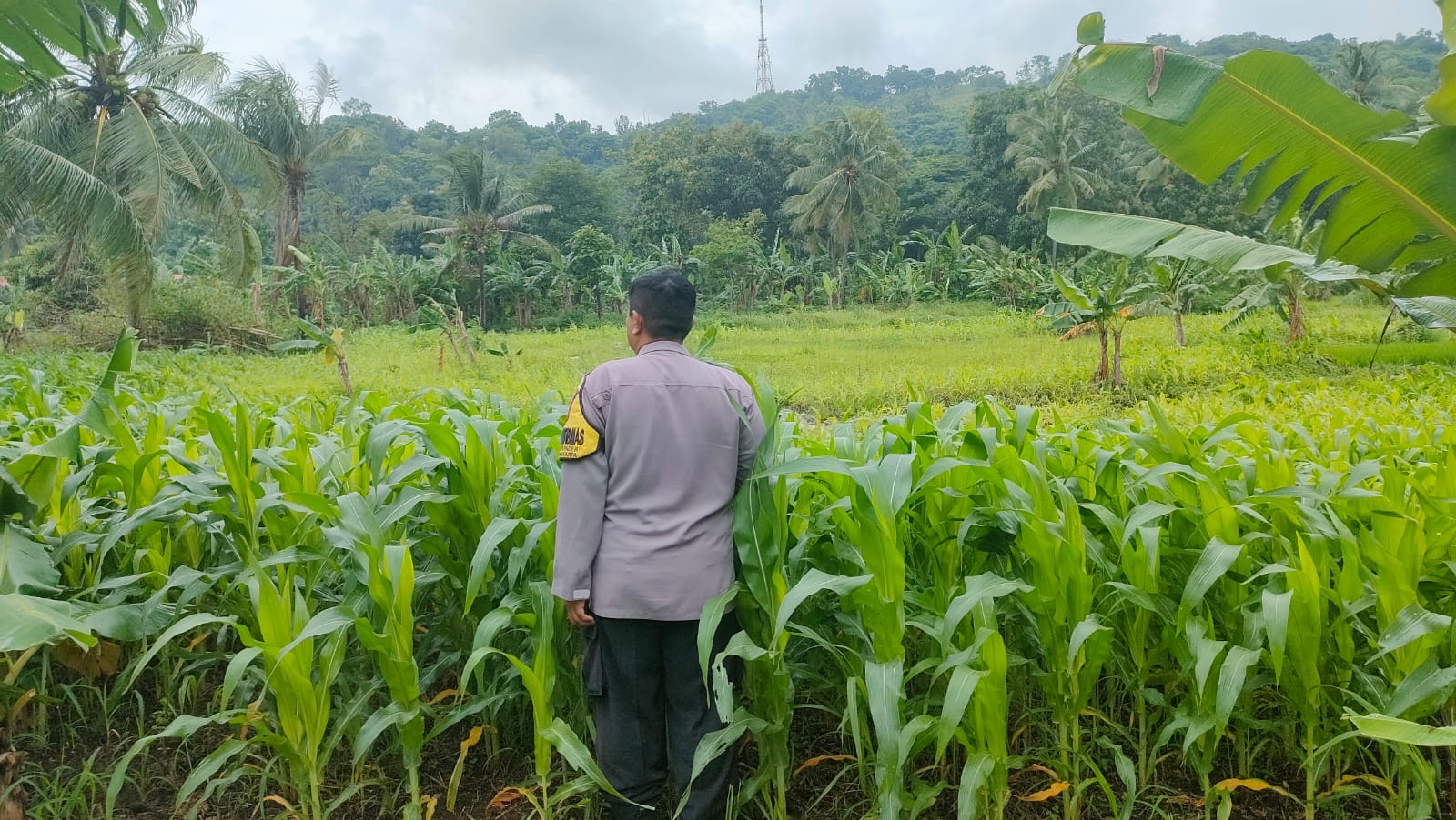 Dalam kunjungannya, Aiptu Wawan tidak hanya memeriksa kondisi pertumbuhan tanaman jagung yang sedang berada pada fase pengembangan, namun juga memberikan arahan sederhana terkait perawatan dan pencegahan hama serta penyakit tanaman kepada para petani lokal.