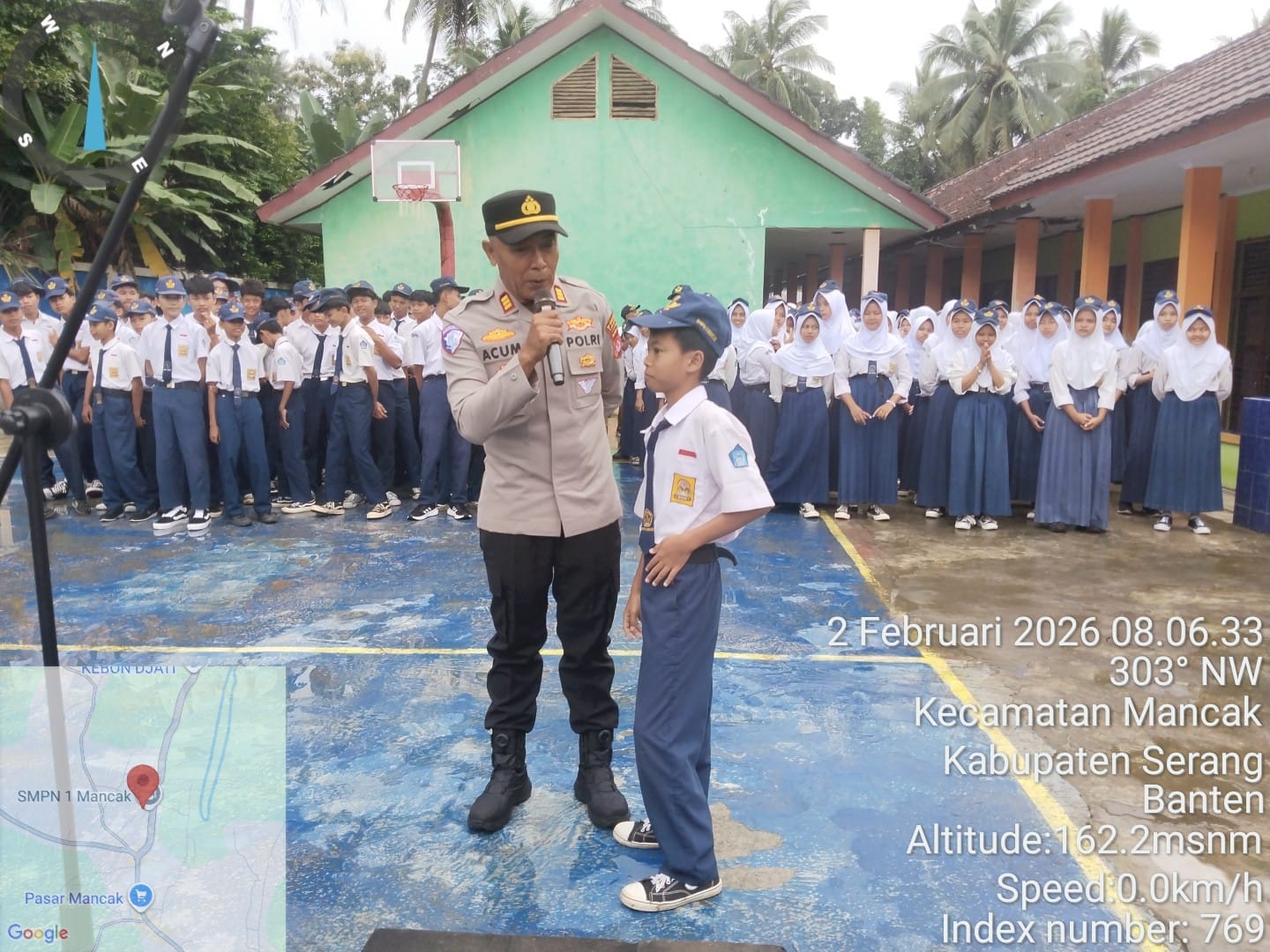 Kapolres Cilegon Polda Banten AKBP Dr. Martua Raja Taripar Laut Silitonga melalui Kapolsek Mancak AKP ACUM SUTARLIA Beserta Bhabinkamtibmas AIPDA AGUS YEYEN, AIPDA DARSIWAN Melaksanakan giat *Sambang dan silaturahmi dalam rangka Police goes To School dan Pelaksanaan Commander Wish Kapolres Cilegon yaitu TRENDING* dalam *Upacara Bendera* di Lapangan SMPN 1 Mancak Kec. Mancak Kab. Serang. Dalam sambutanya Kapolsek Mancak menyampaikan pesan-pesan Kamtibmas dalam upacara bendera sebagai berikut: