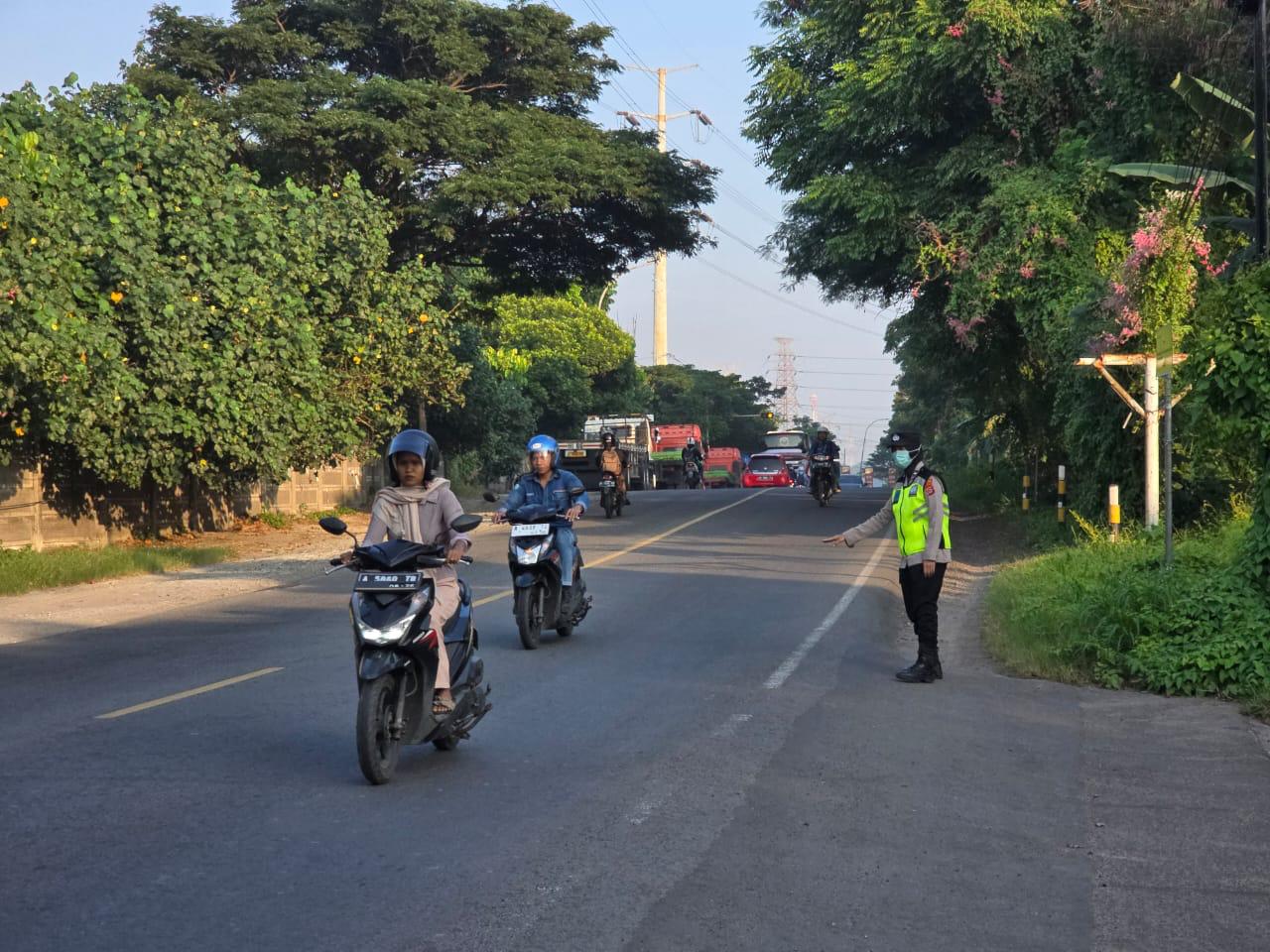 Cilegon,Polres Cilegon Polda Banten Pada Selasa/03/01/2026 Pukul 06.30 Wib, Personil Siwas Polres Cilegon, Aipda Emi Prasetyo melaksanakan kegiatan pengaturan arus lalu lintas di Jalur Protokol jalan utama Kota Cilegon tepat nya di jalur depan perumahan arga baja Pura Kota Cilegon.